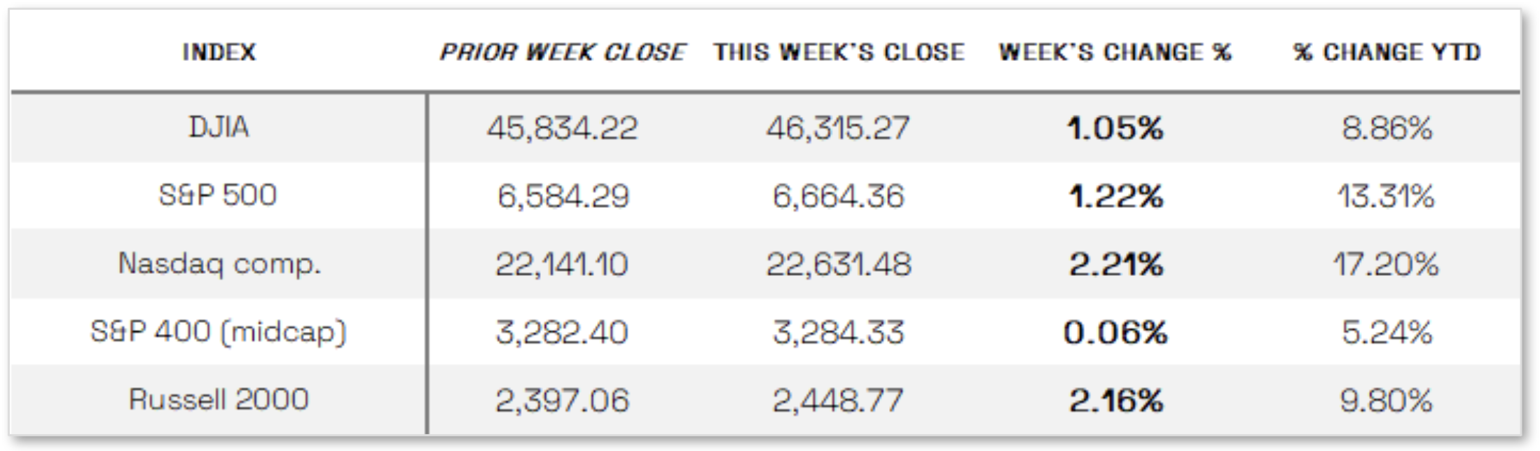 Markets up this week: Major U.S. stock indexes climbed to record highs during the week after the Federal Reserve cut short-term interest rates for the first time in nine months, with small-cap stocks—often more sensitive to rate changes—rallying as the Russell 2000 gained 2.16%; the Nasdaq Composite rose 2.21%, while the S&P 500 and Dow Jones Industrial Average advanced 1.22% and 1.05%, respectively. Trade developments also drew attention after a Friday call between U.S. President Donald Trump and Chinese President Xi Jinping, during which Trump later announced on social media that they had reached an agreement on U.S. ownership of TikTok and made progress on broader trade negotiations.