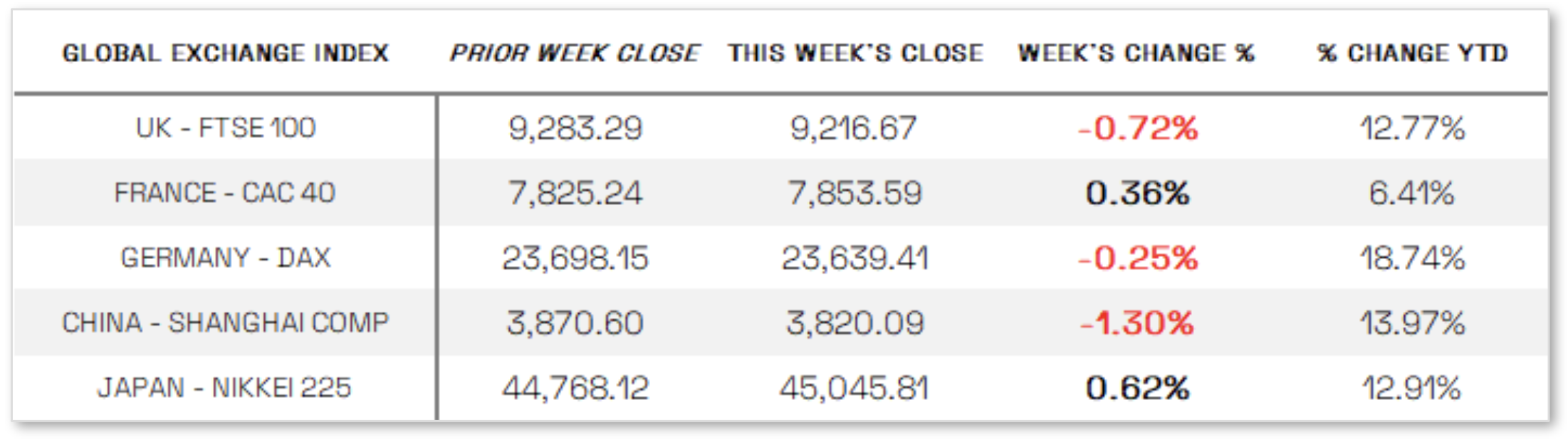 EUROPE: In local currency terms, the pan-European STOXX Europe 600 Index finished the week slightly lower as investors digested a series of monetary policy decisions, with major indexes posting mixed results: France’s CAC 40 gained 0.36%, Germany’s DAX slipped 0.25%, Italy’s FTSE MIB fell 0.60%, and the UK’s FTSE 100 dropped 0.72%. The Bank of England, in a 7–2 vote, left its key interest rate unchanged at 4% as expected but slowed the pace of its bond sales to GBP 70 billion annually from GBP 100 billion to limit pressure on the gilt market amid elevated long-term yields; Governor Andrew Bailey emphasized that while inflation is expected to return to the 2% target, future rate cuts must be gradual and cautious.