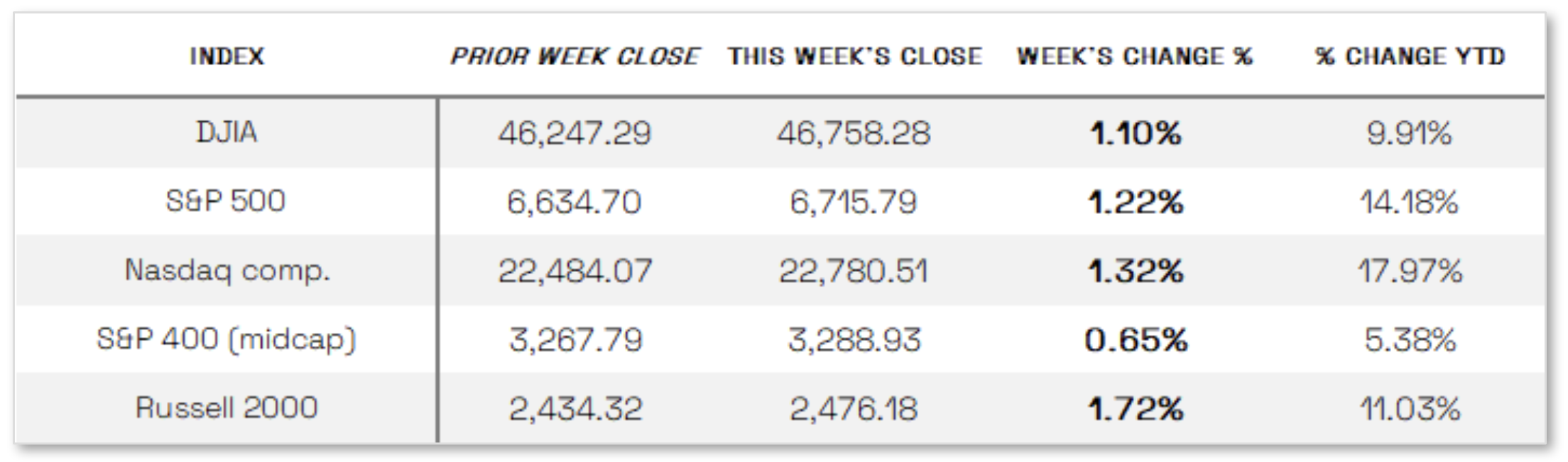 Stocks up despite government shutdown: Stocks posted solid gains despite the U.S. government shutdown that began Thursday after lawmakers failed to reach a funding deal to keep nonessential operations open. In a “bad news is good news” environment, equities found support from ADP’s September private payrolls report showing job losses, which investors interpreted as increasing the likelihood of a Federal Reserve rate cut in October. The technology-heavy Nasdaq Composite led the advance, with growth stocks outperforming value, while the small-cap Russell 2000 Index, typically more sensitive to lower rates, outpaced the broader S&P 500. In commodities, West Texas Intermediate crude oil fell more than 7% after OPEC+ signaled plans to raise production in November, weighing on value stocks, while gold climbed over 3% and copper surged more than 6%, reflecting strength in industrial demand.