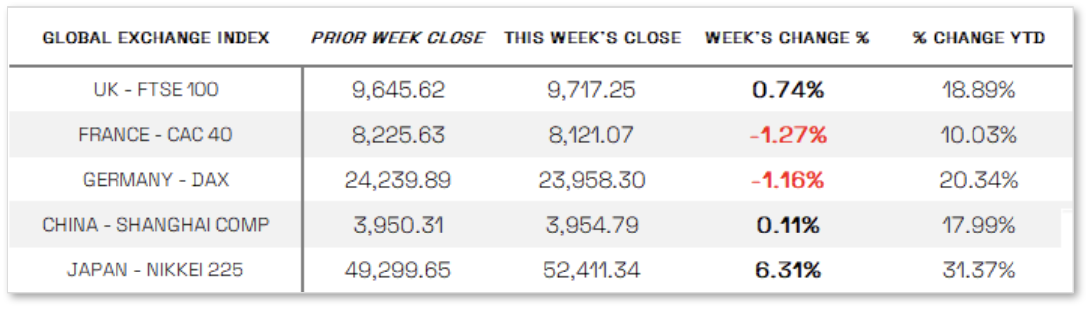 CHINA: Mainland Chinese stocks ended the week mixed as lingering concerns over a slowing economy offset optimism about easing U.S.-China trade tensions. The onshore CSI 300 Index slipped 0.43%, while the Shanghai Composite Index inched up 0.11%, according to FactSet data. In Hong Kong, the benchmark Hang Seng Index fell 0.97%, reflecting continued investor caution despite signs of improving trade relations.