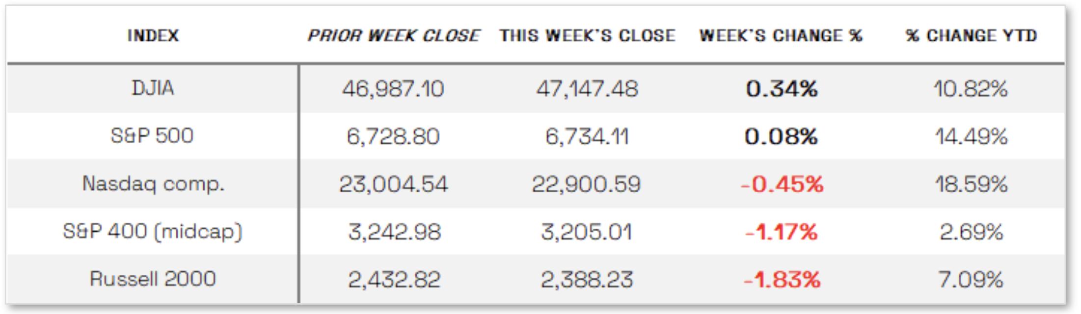 Stocks Mixed this week: U.S. stocks ended the week with mixed results: the Dow Jones Industrial Average and S&P 500 posted modest gains, while the Nasdaq Composite, S&P MidCap 400, and small-cap Russell 2000 declined amid concerns about elevated valuations and increased scrutiny of artificial intelligence spending, which contributed to a rotation out of growth-oriented names that had recently driven markets to record highs. Although stocks were mostly lower through Thursday, a volatile but catalyst-light session on Friday helped some indexes recover enough to finish the week higher. Meanwhile, the longest U.S. government shutdown on record ended Wednesday night after President Donald Trump signed a spending bill funding the government through January 30, removing a key market headwind even as uncertainty lingered regarding how quickly conditions would normalize. Economic data also remained in focus: White House officials warned that October jobs and inflation data may never be released, and the Bureau of Labor Statistics said it needed more time to determine future release dates, later announcing that the delayed September jobs report will be issued on Thursday, November 20.