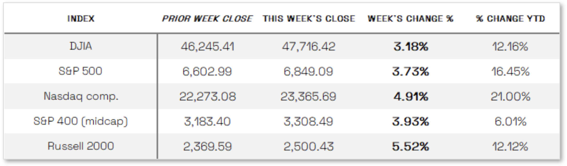 Stocks up in short week: U.S. stock indexes ended the holiday-shortened week higher, supported by dovish remarks from some Federal Reserve officials and weaker-than-expected economic data that bolstered expectations for a potential rate cut in December. Small-cap stocks led the gains, with the Russell 2000 Index jumping 5.52%, while the tech-heavy Nasdaq Composite rebounded strongly from the previous week’s sell-off, as investor concerns over high valuations and AI-related spending gave way to renewed optimism about the sector’s growth potential. Markets were closed Thursday for the Thanksgiving holiday. In economic news, delayed data releases due to the government shutdown showed signs of a slowing economy. September retail sales rose just 0.2%, down from 0.6% in August and below forecasts, while control group sales—important for GDP calculations—fell 0.1%. Additionally, the September Producer Price Index (PPI) increased 0.3%, in line with expectations, but core PPI, which strips out food and energy, rose just 0.1%, suggesting muted wholesale inflation.